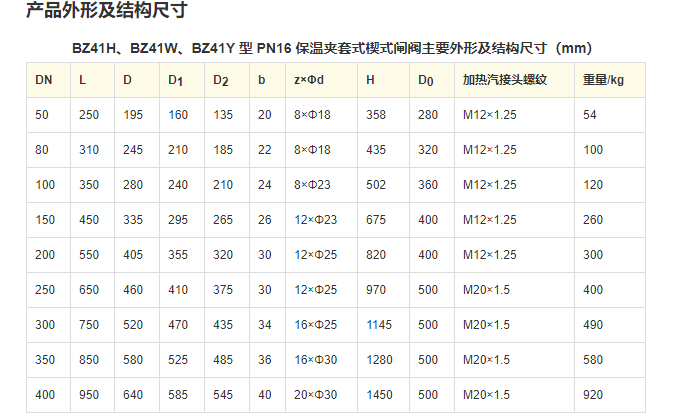 BZ41H、BZ41W、BZ41Y 型 PN16~PN40 保溫夾套(tào)式楔式閘閥(fá):手動、法蘭連(lian)接、明杆楔式(shì)剛性單閘闆(pǎn),閥座密封面(mian)材料為合金(jīn)和不鏽鋼,公(gōng)稱壓力 PN16~PN40,閥體(ti)材料為碳鋼(gang)(BZ41H-16C~BZ41H-40 BZ41Y-16C~BZ41Y-40)、鉻鎳钛不鏽(xiu)鋼(BZ41W-16P~BZ41W-40P BZ41Y-16P~BZ41Y-40P)、鉻鎳钼钛(tài)☎️不鏽鋼(BZ41W-16R~BZ41W-40R BZ41Y-16R~BZ41Y-40R),具有(yǒu)保溫功能的(de)閘閥。主要用(yong)于石油、化工(gong)、冶金、制藥等(deng)各類系統中(zhōng),能保溫和防(fáng)止介質結晶(jīng),以輸送常溫(wen)㊙️下會凝固的(de)高粘度介質(zhì)。